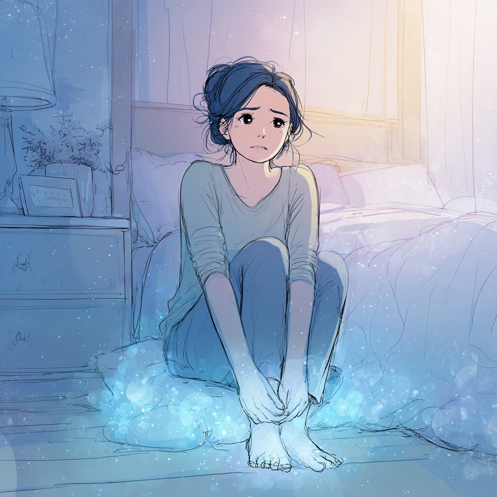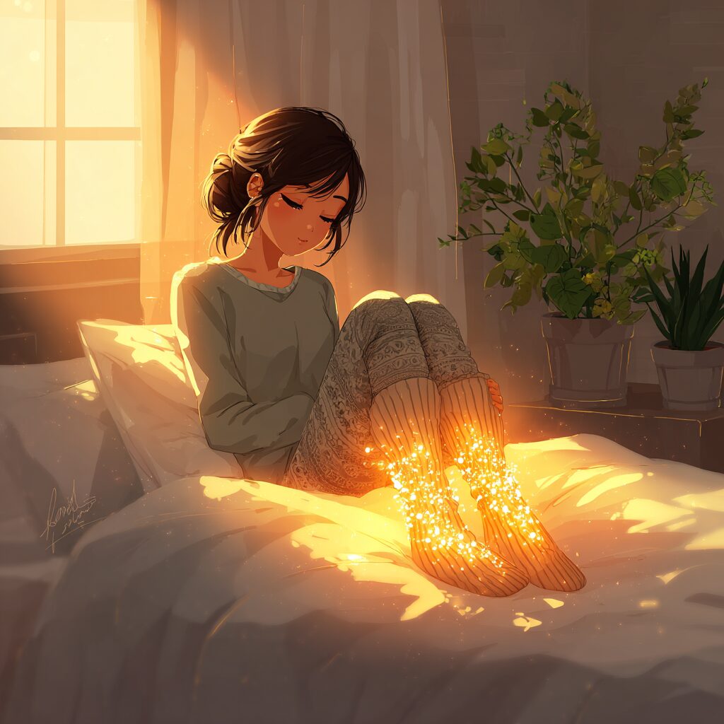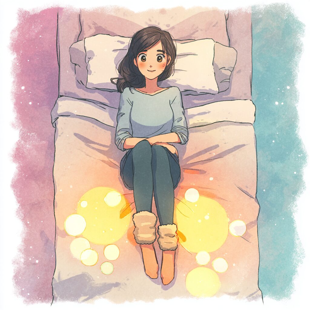 入眠時には、深部体温を下げるために手足の末梢血管を広げて熱を放出する必要があります。足が冷えているとこの放熱がうまくいかず、体温がスムーズに下がらないため、寝つきが悪くなります。